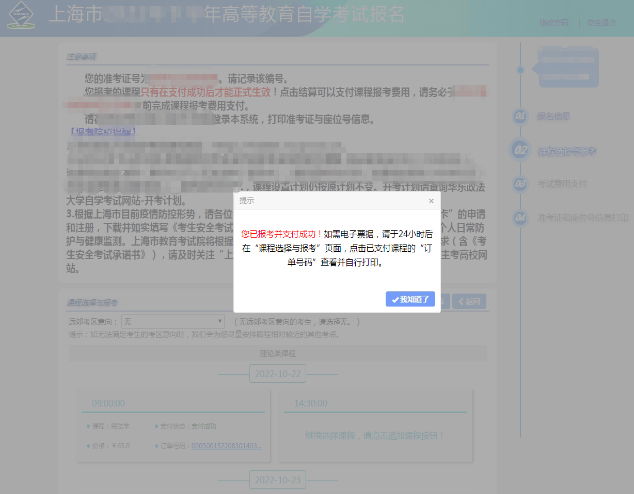 图:上海市高等教育自学考试报名平台--支付信息页面