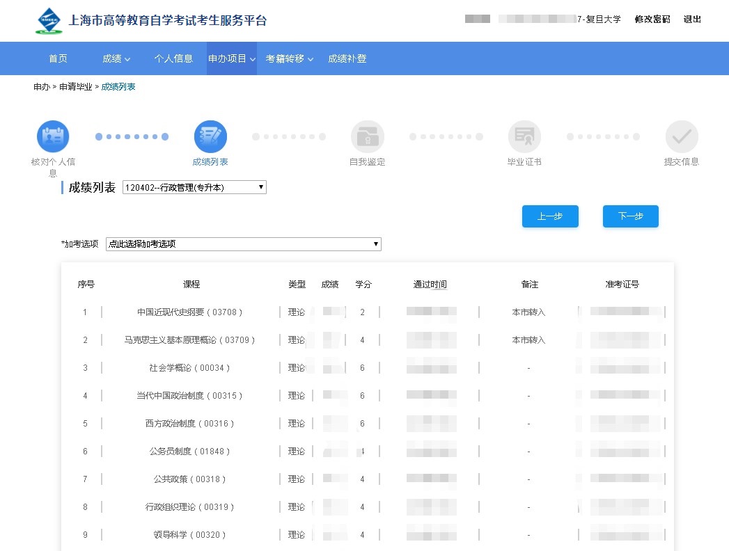 图:上海市高等教育自学考试报名平台——报名信息页面