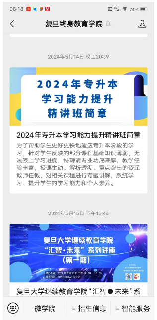 请扫描以下二维码关注微信“复旦终身教育学院”,进入“智能服务”页面,并输入相关问题进行咨询。