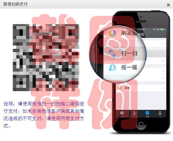 1.微信支付:你需要一台已经安装微信客户端的智能手机,扫描页面弹出的二维码,使用微信钱包中的零钱或绑定银行卡即可完成支付(支持银行列表、卡种及额度参见微信官方说明);