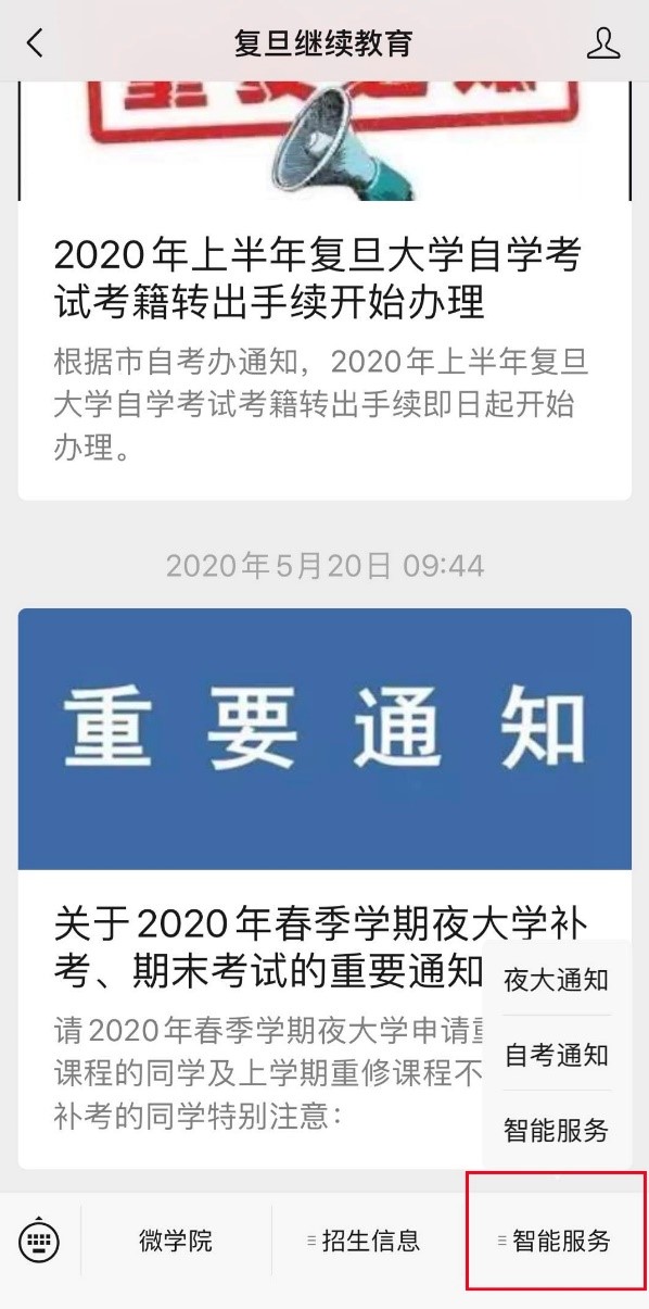 答:考生可关注williamhill官方网站继续教育学院的公众号“复旦继续教育”,并通过智能服务进行相关信息的咨询。