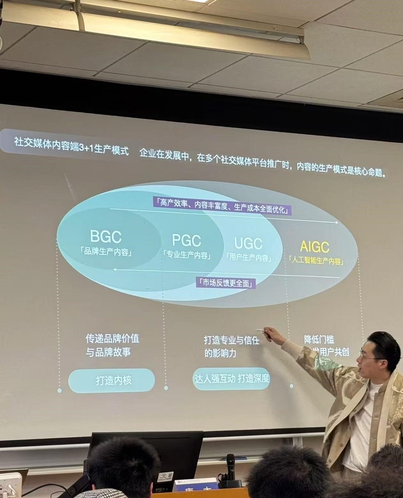 “AI前沿应用”课程讲师赵卫东教授,以浅入深,以AIGC在办公应用上的初级使用入手,教会大家如何在职场提升工作效率,将自己从传统单一的工作模式中解放出来;“AI实操课程”讲师李奕辰,作为AI春晚发起人,分享如今最先进的AI视频生成工具,并结合巧妙构思,所创作的作品屡屡获奖的经验心得;“AI社交媒体运营与推广”讲师唐木,结合AIGC技术与自媒体运营,为大家剖析了小红书、抖音等自媒体的运营逻辑,讲授训练AI的方法和公式,更精准地用AI输出个人IP或品牌的打造。